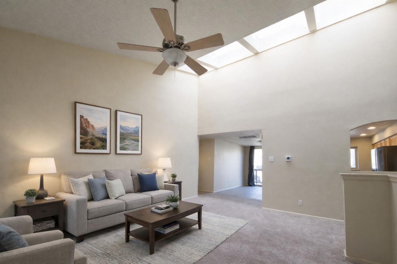 Enjoy foothills living in this bright 3-bed, 2-bath condo featuring soaring vaulted ceilings and skylights that fill the living room with natural light and an open, spacious feel. Located in a highly desirable, tucked-away low-traffic corridor, this second-level home offers two private balconies with beautiful views and direct access to nearby trails for hiking and mountain biking. Fresh paint, covered parking, in-unit laundry, and brand-new appliances--including refrigerator, range, dishwasher, washer & dryer--add everyday convenience. HOA covers common areas, exterior of residence Water, Sewer, & Trash. Photographs furnished digitally